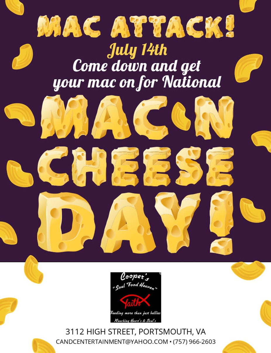 Mac Attack! Come down and get your mac on for National Mac n' Cheese Day July 14th!